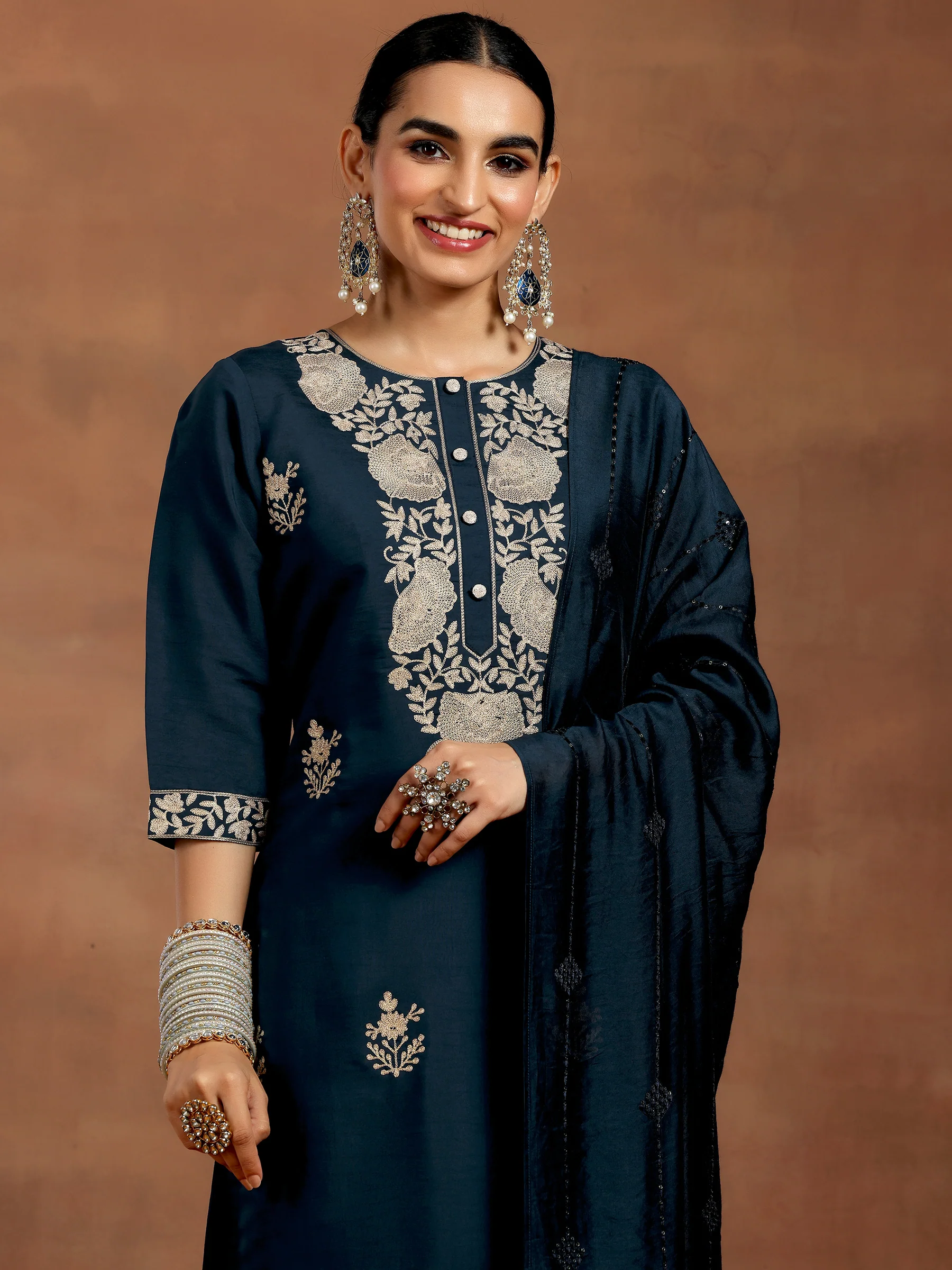 Blue Yoke Design Silk Blend Straight Suit With Dupatta