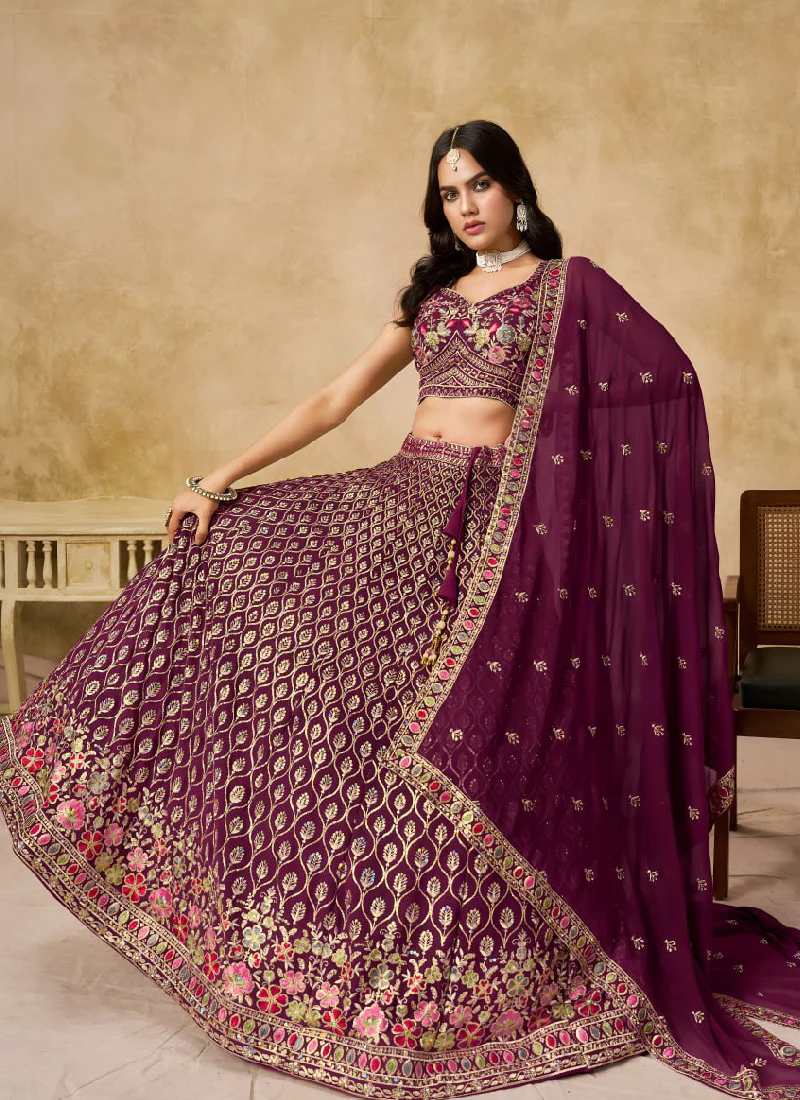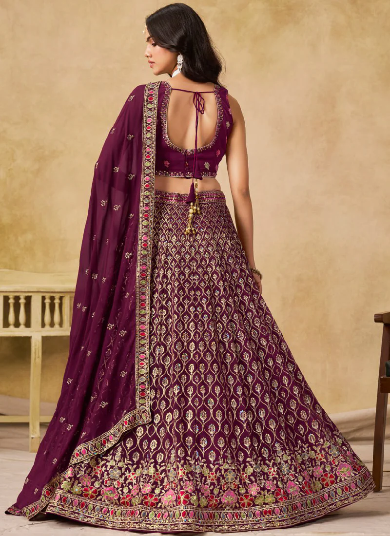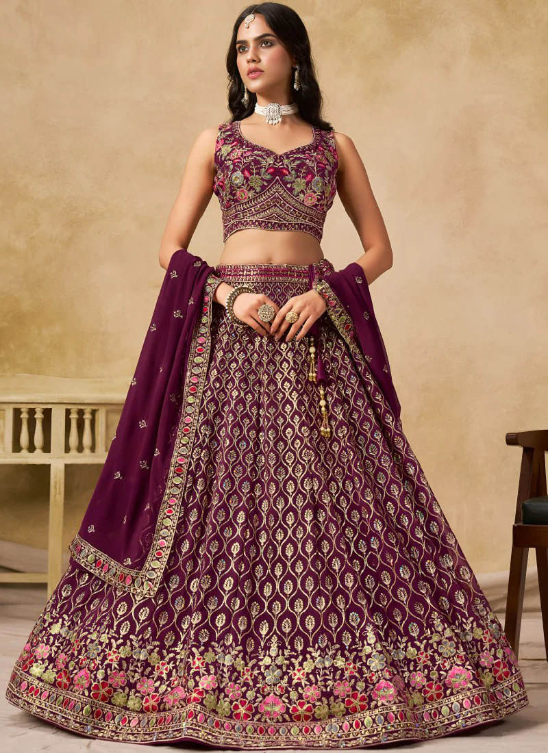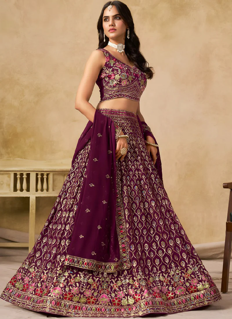 Designer Georgette Thread Embroidered Work Wine Crop Top Lehenga