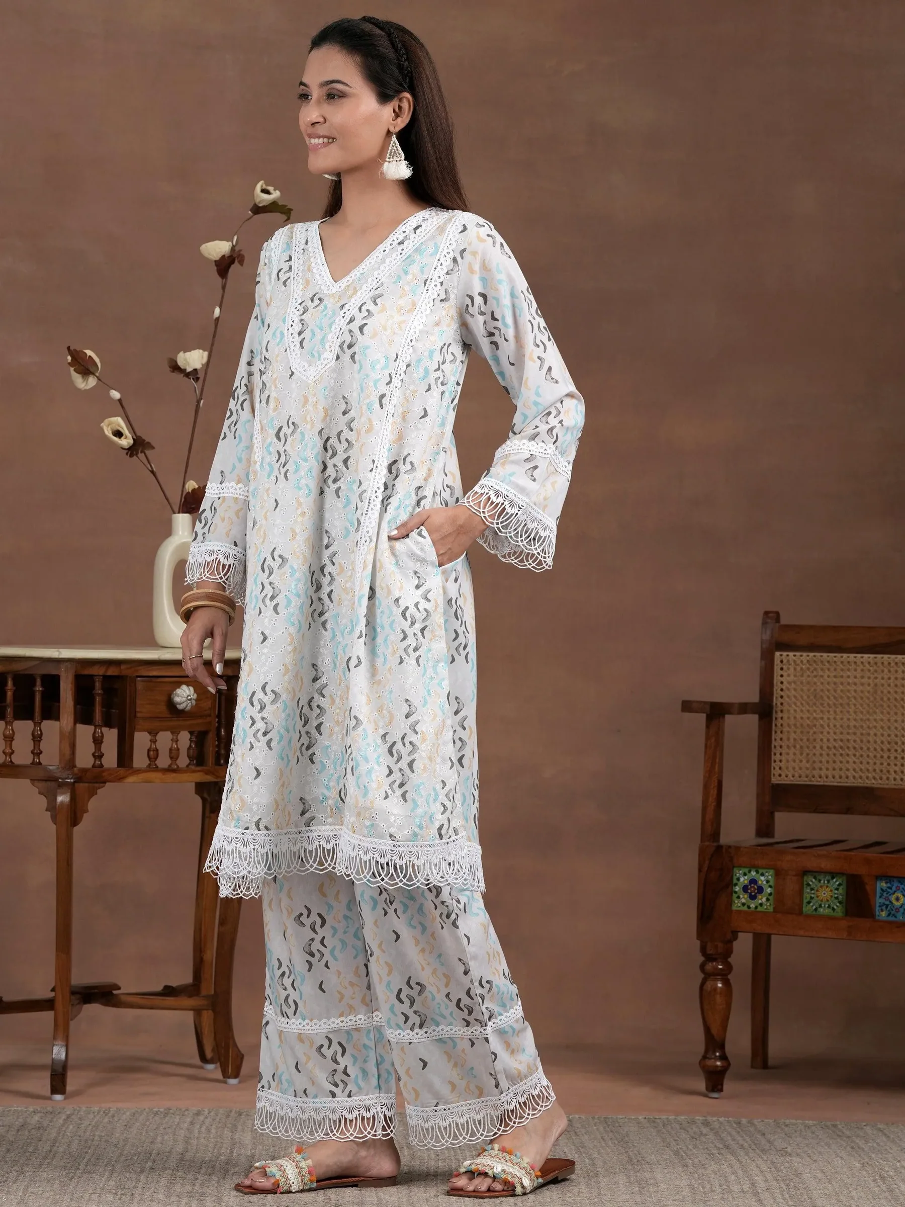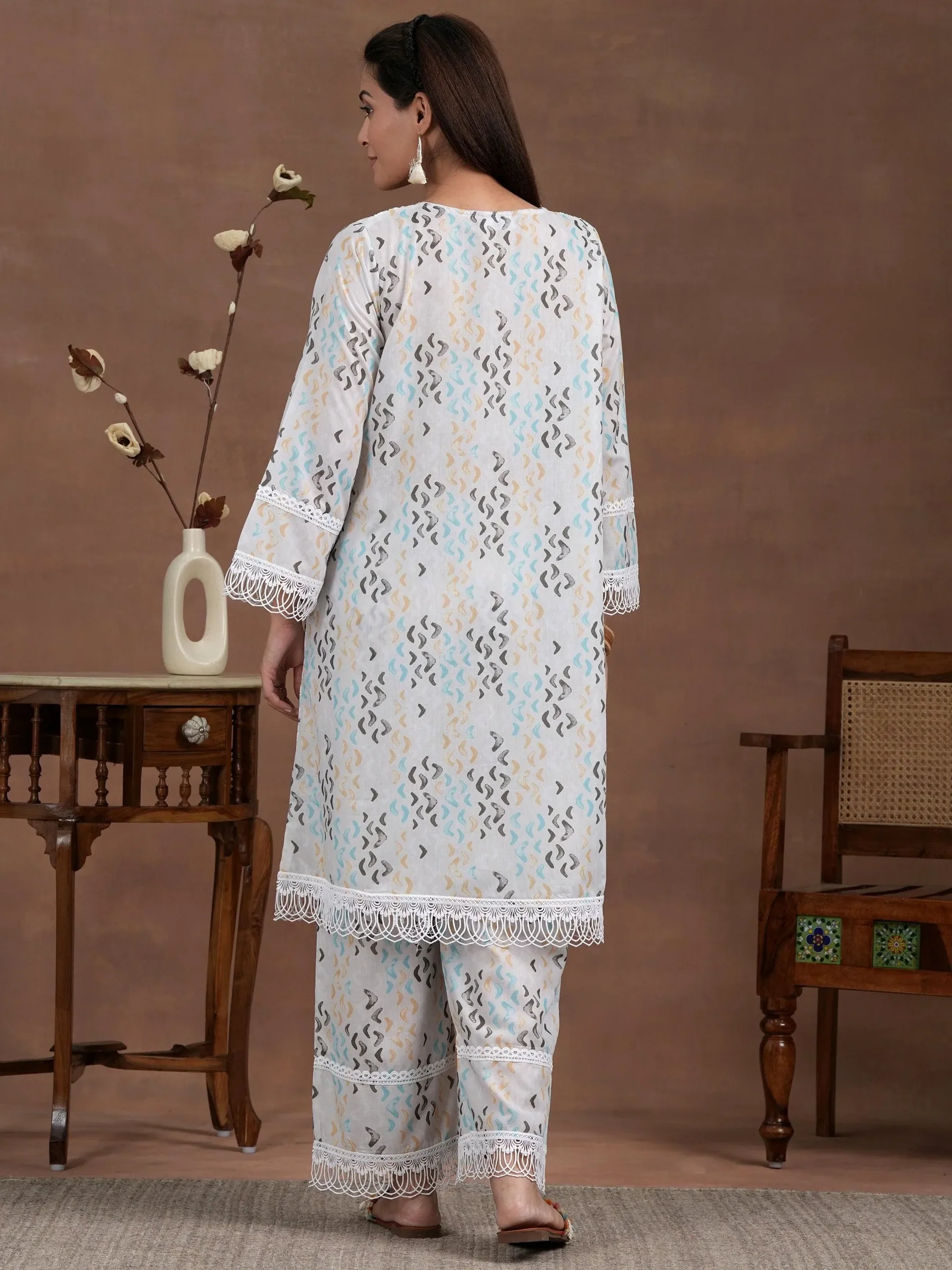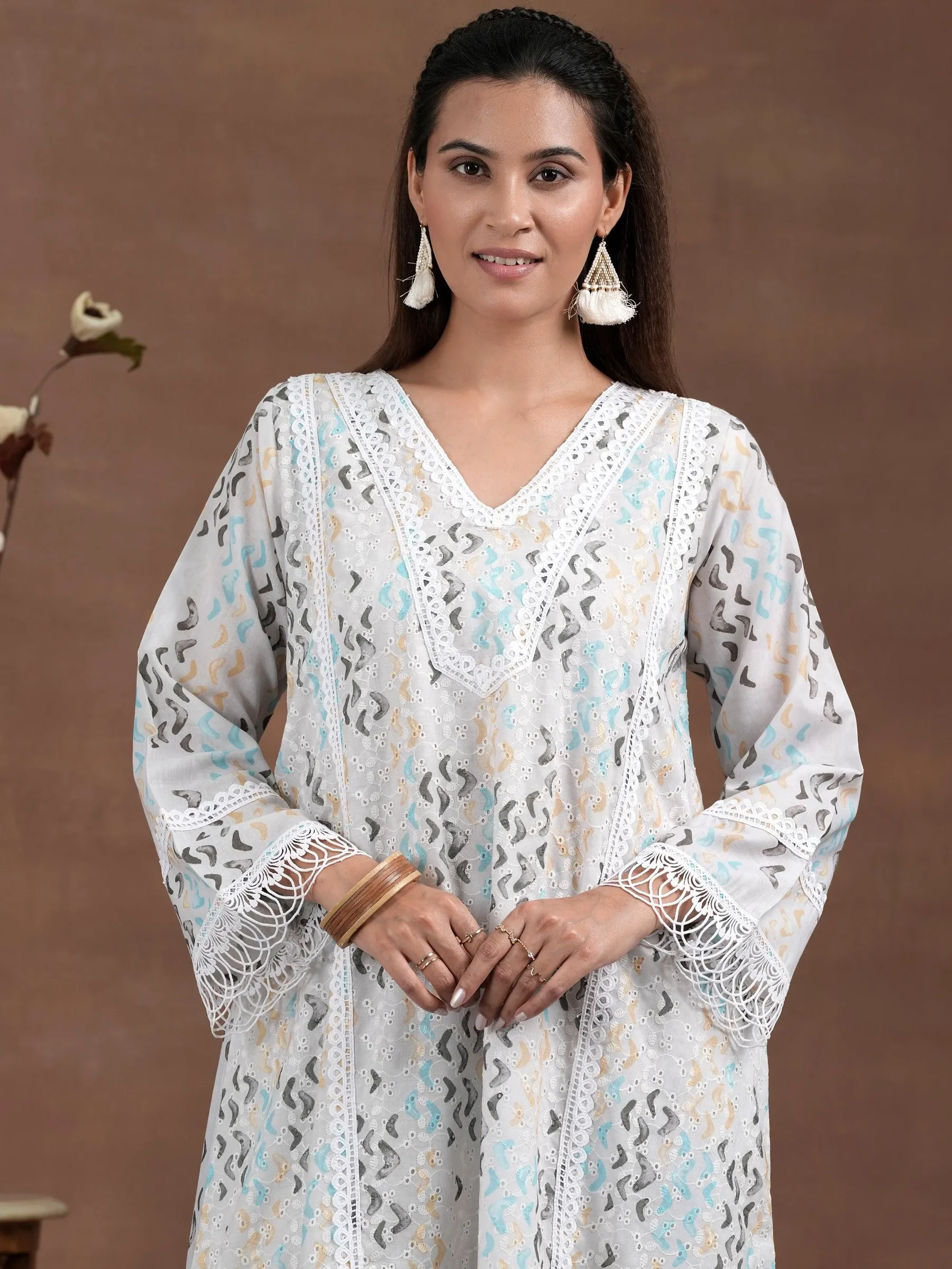 Off white Printed Cotton A-Line Kurta With Palazzos