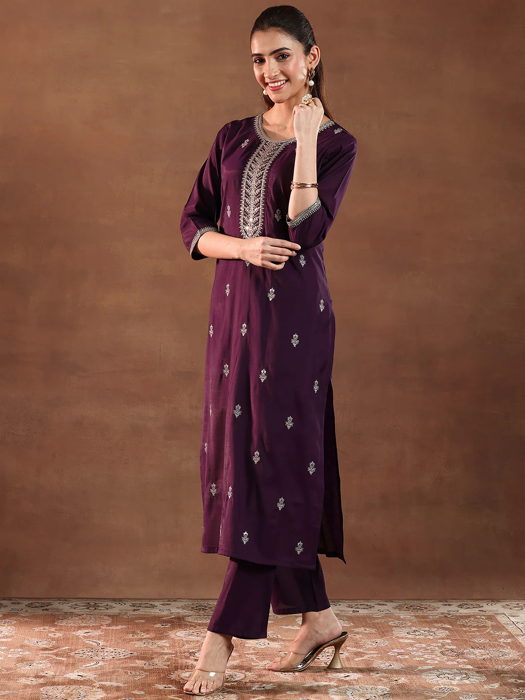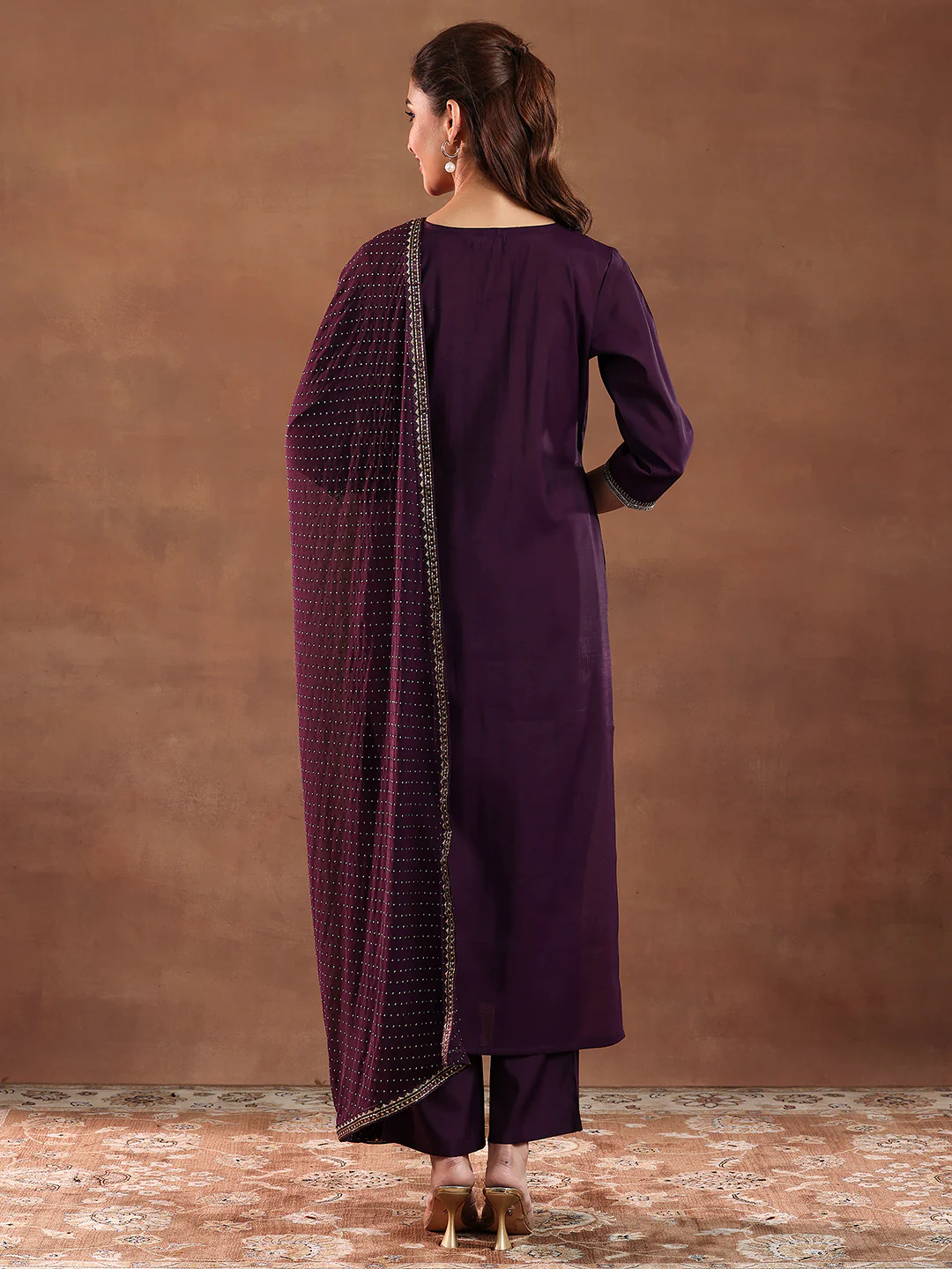 Wine Embroidered Silk Blend Straight Suit With Dupatta